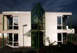 Das Verwaltungsgebäude wurde konventionell in Mauerwerksbau erstellt. Ein großzügiger Eingangsbereich in einer Aluminium - Glaskonstruktion mit dem lichtdurchfluteter
