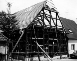 abgesichert werden musste. Von der Geschossdecke waren nur noch die tragenden Balken vorhanden. Teilweise mussten Fachwerk und Balken durch Fäulnis und Holzwurmbefall ausgewechselt